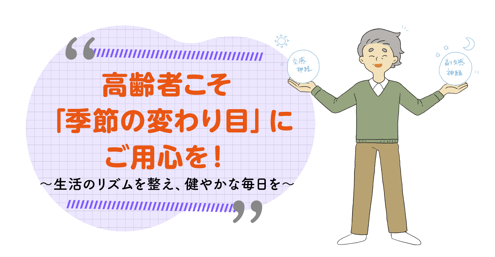 季節の変わり目の体調管理はなかなか難しいですが、もし、なんとなくだるさや不調を感じている高齢者がいらっしゃる場合は、ここでご紹介した対策を取り入れて、毎日の生活を見直してみるようにしてください。
