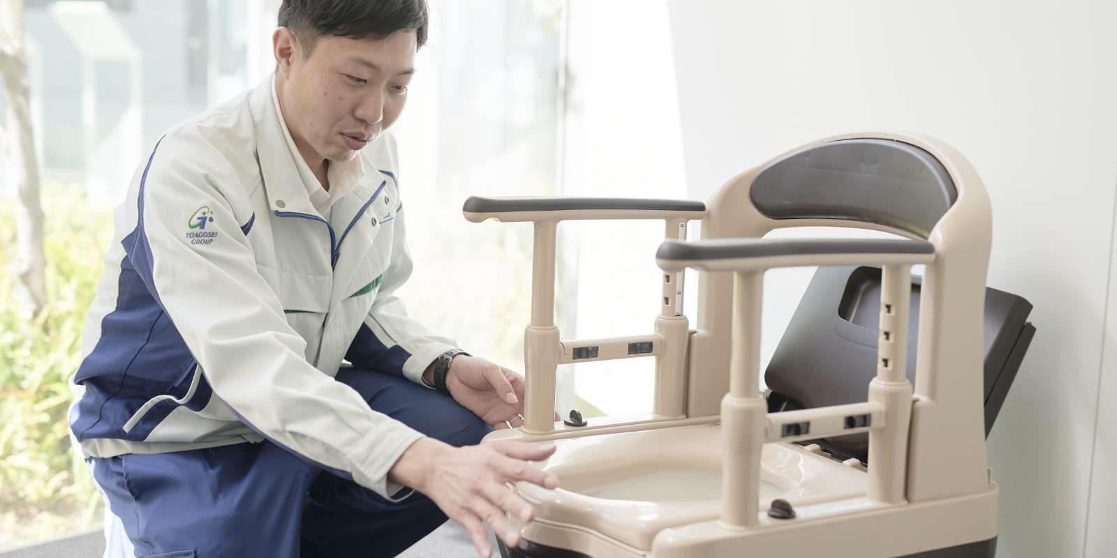 ポータブルトイレとは、持ち運びが可能で寝室など室内に設置するトイレのことだ。今では介護施設をはじめ、自宅などで多くの方々に利用されている『ジャスピタ』だが、この製品はある社員の執念なくして誕生しなかったといっても過言ではない。それがライフサポート事業部の青山智行である。