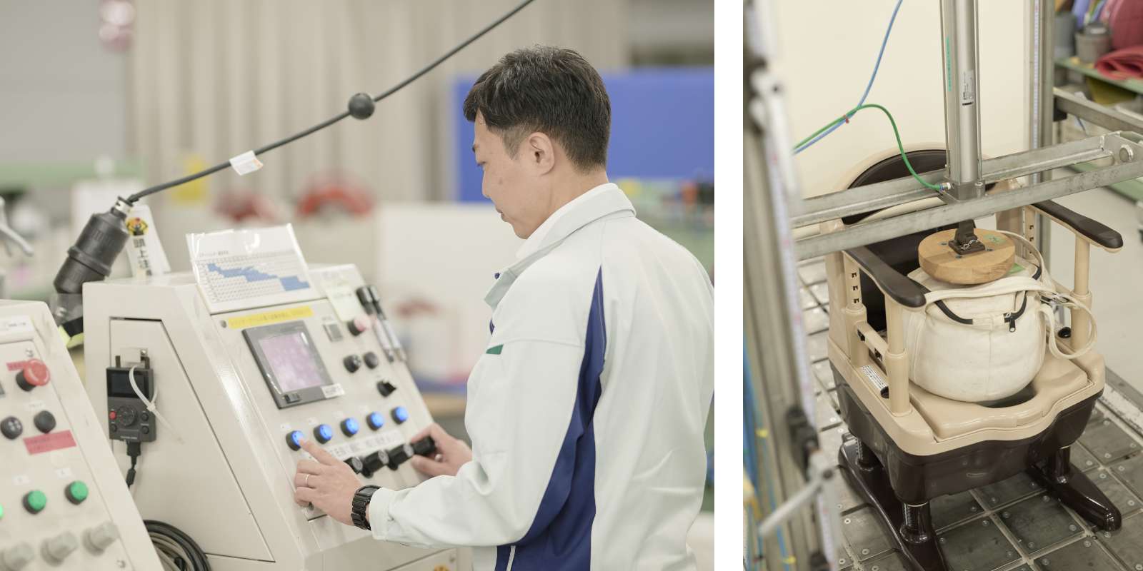 そこから開発チームはさらに試行錯誤し、どうすれば実現できるかを考える日々。開発チームの熱意に打たれ、設計や営業部員もさまざまなアドバイスや代案をくれた。その結果、便器においては二つのパーツに分けて型をつくり、接合後にビス止めをして強度をつけるという、樹脂加工を得意とするアロン化成ならではの方法で理想の形状を実現させることができた。また、必要な機能はしっかりと備えながらも、なるべくシンプルな構造にすることでサイズや価格を抑えることに成功。量産、販売のためのいくつものハードルを、一つずつ丁寧に、執念でクリアしていったのだ。