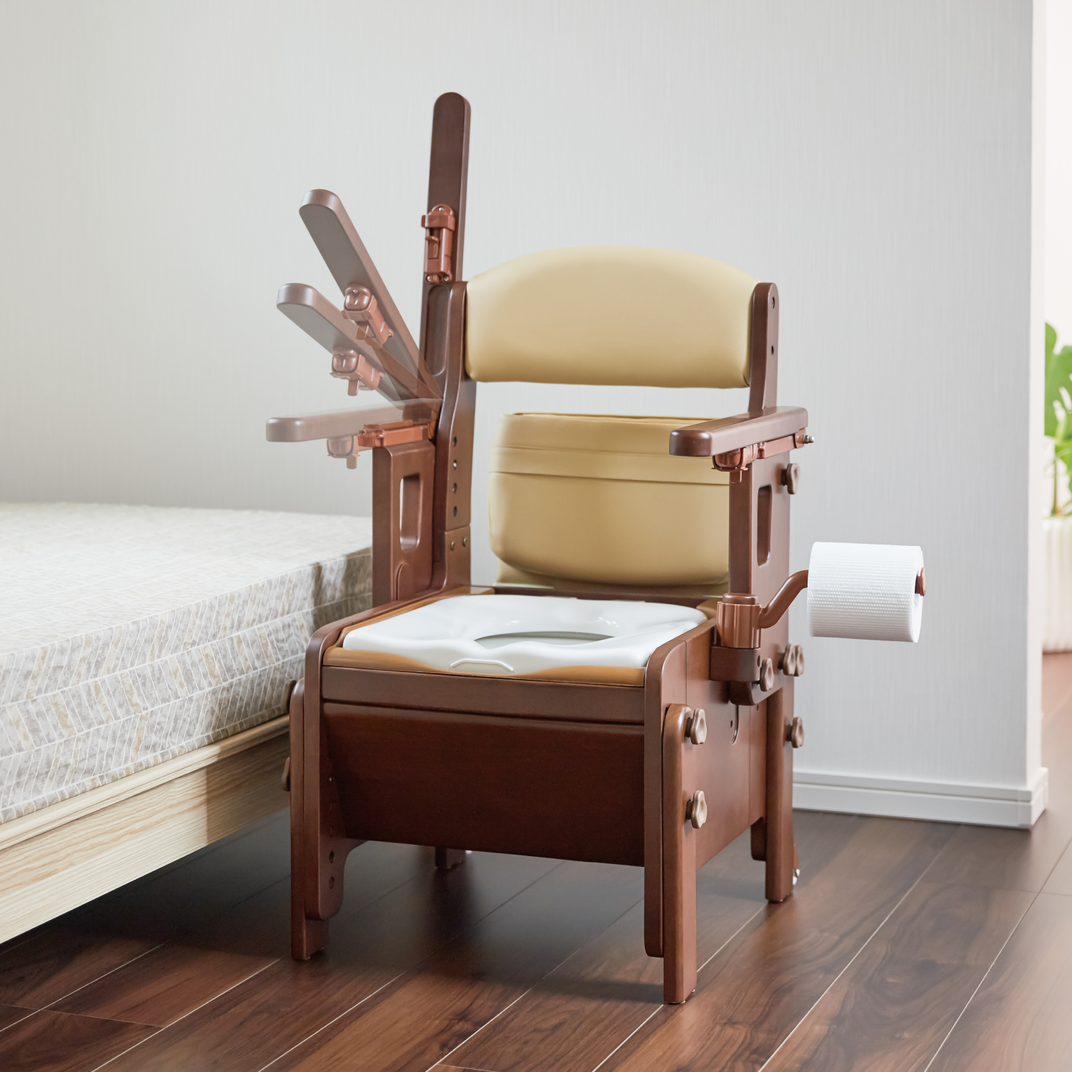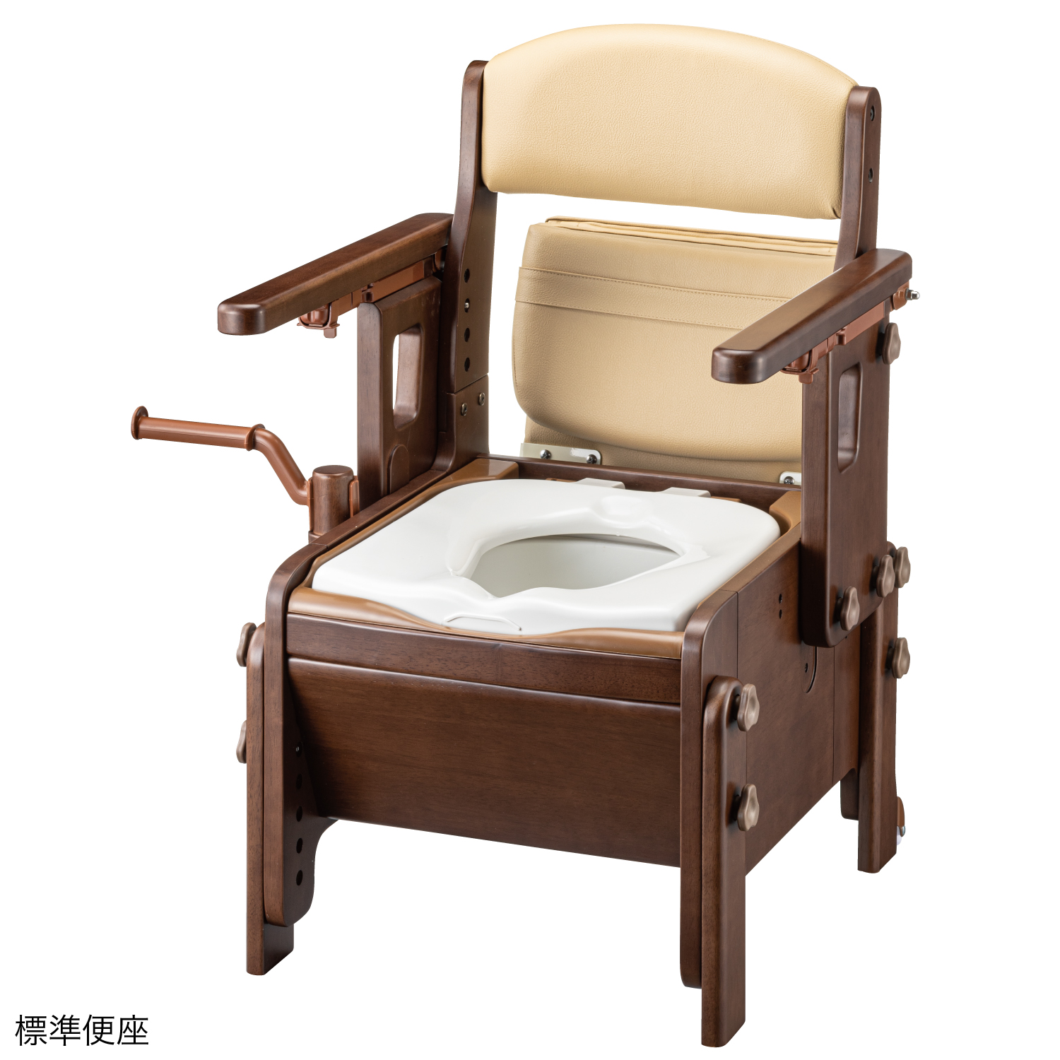 お客様の声からスマートなトイレ、できました。 ひじ掛けはね上げがワンタッチで簡単。ひじ掛けはね上げがワンタッチで簡単。 使う方にも住環境にもちょうど良いサイズ! 本体幅52cmでコンパクト。ひじ掛け内寸42cmでゆったり座れる。