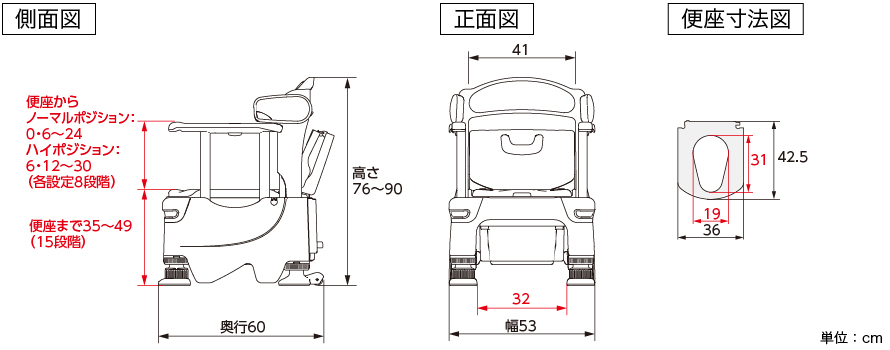 幅53×奥行60×高さ76~90cm(便座までの高さ:35~49cm)