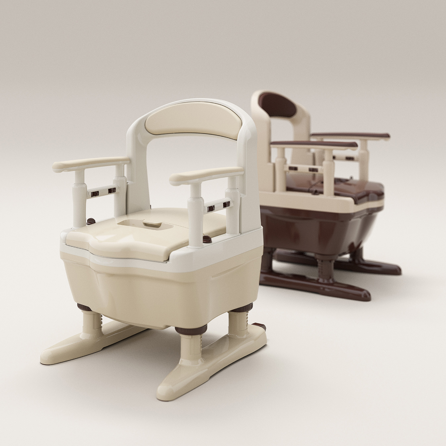 「尿こぼれ」を防ぐポータブルトイレの新しいカタチ。ドルフィンカットが理想的な排泄姿勢に導く。