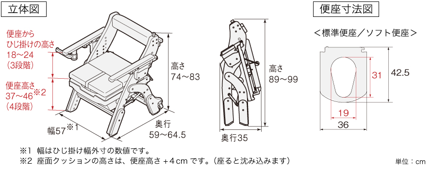 標準・ソフトキャスター付タイプ:幅57×奥行59~64.5×高さ74~83cm (便座までの高さ:37・40・43・46cm)