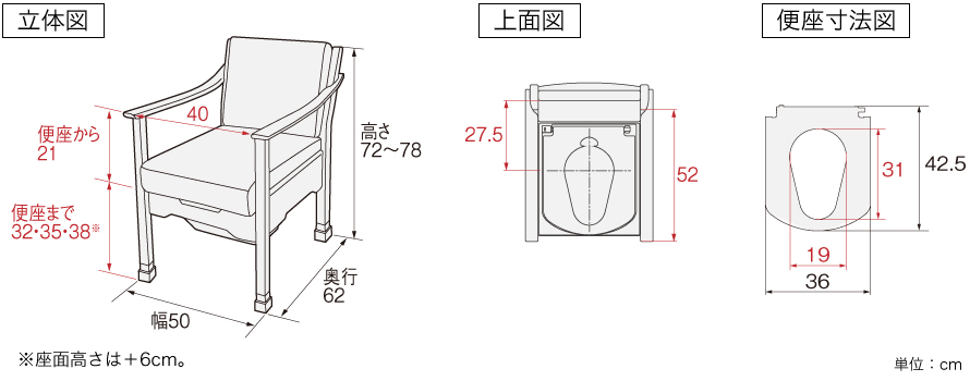 幅50×奥行62×高さ72~78cm (便座までの高さ:32・35・38cm)