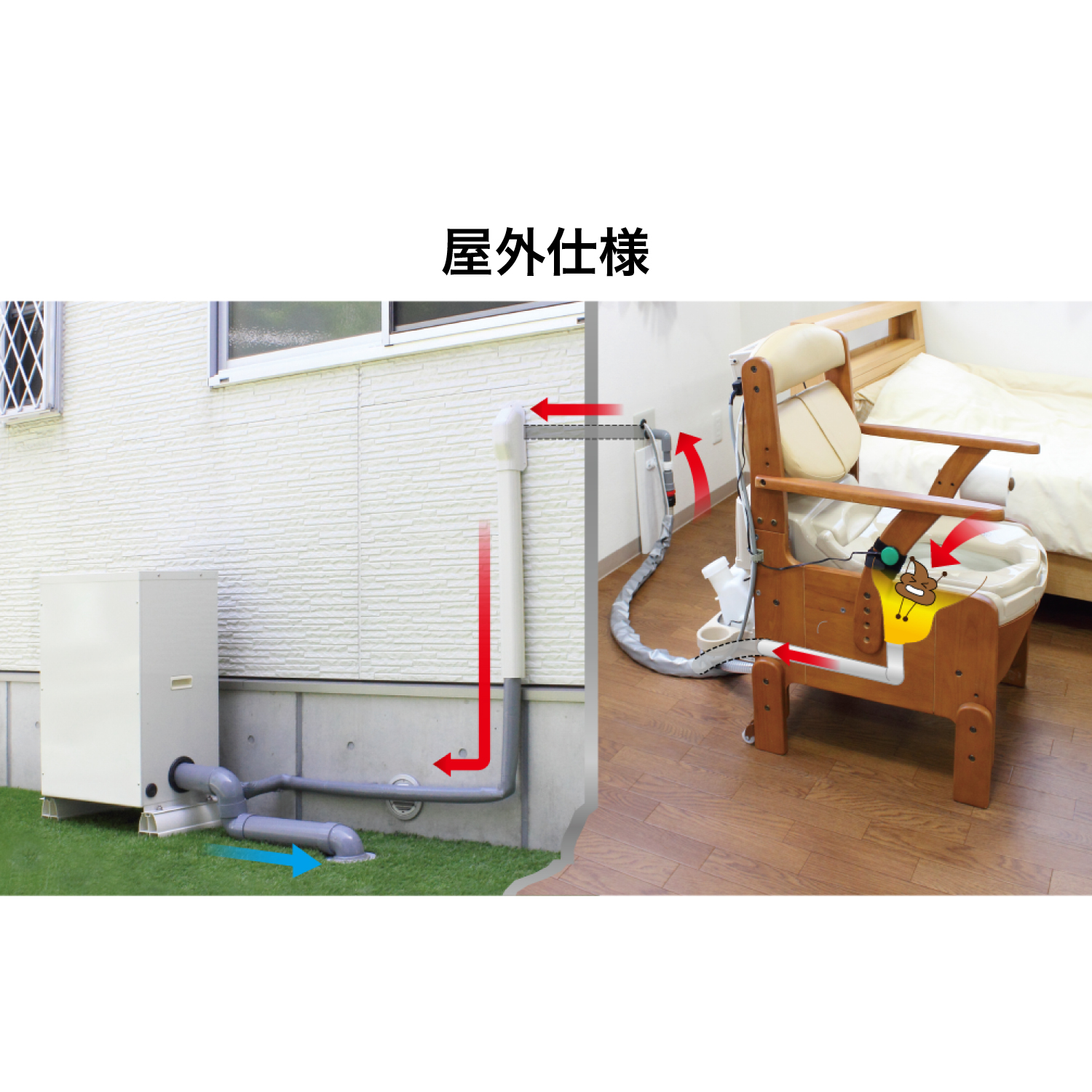 真空圧力を利用して排泄物を一気に吸い込む。水洗式なので後処理の手間が省け、ニオイも気になりません。