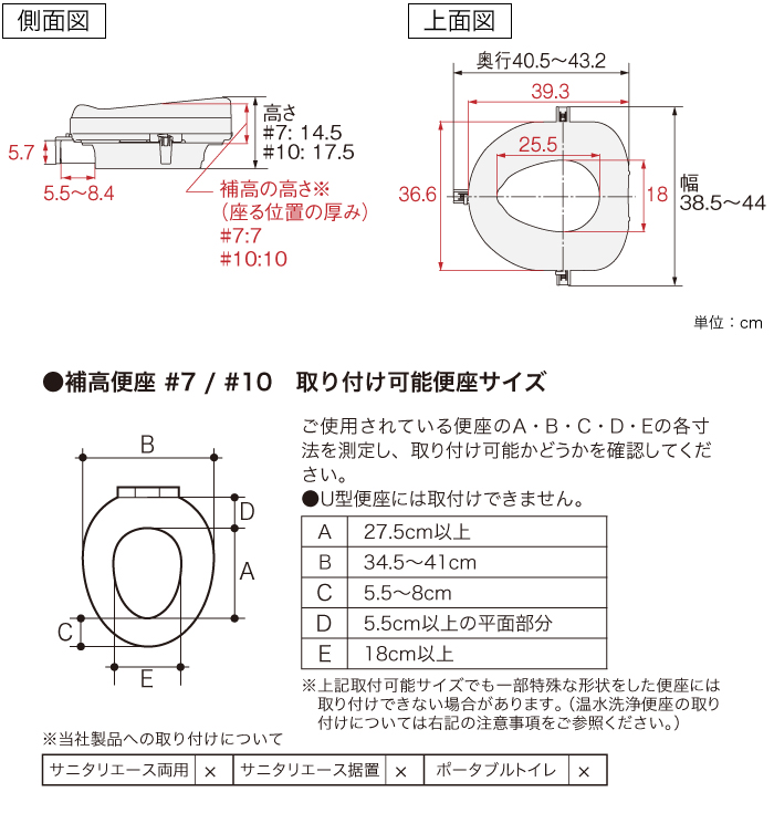 [#7]幅38.5×奥行40.5×高さ14.5cm(補高の高さ:7cm) [#10]幅38.5×奥行40.5×高さ17.5cm(補高の高さ:10cm) 便座内寸:18×25.5cm)