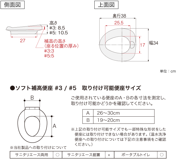 [#3]幅34×奥行38×高さ8.5cm(補高の高さ:3cm) [#5]幅34×奥行38×高さ10.5cm(補高の高さ:5cm) 便座内寸:17×25.5cm)