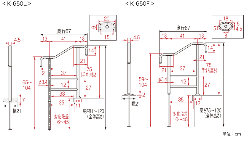 [650L]幅21×奥行67×高さ81~120cm [650F]幅21×奥行67×高さ75~120cm