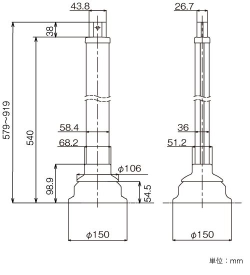 屋外用手すりの部材。手すり高さを無段階で調節できます。