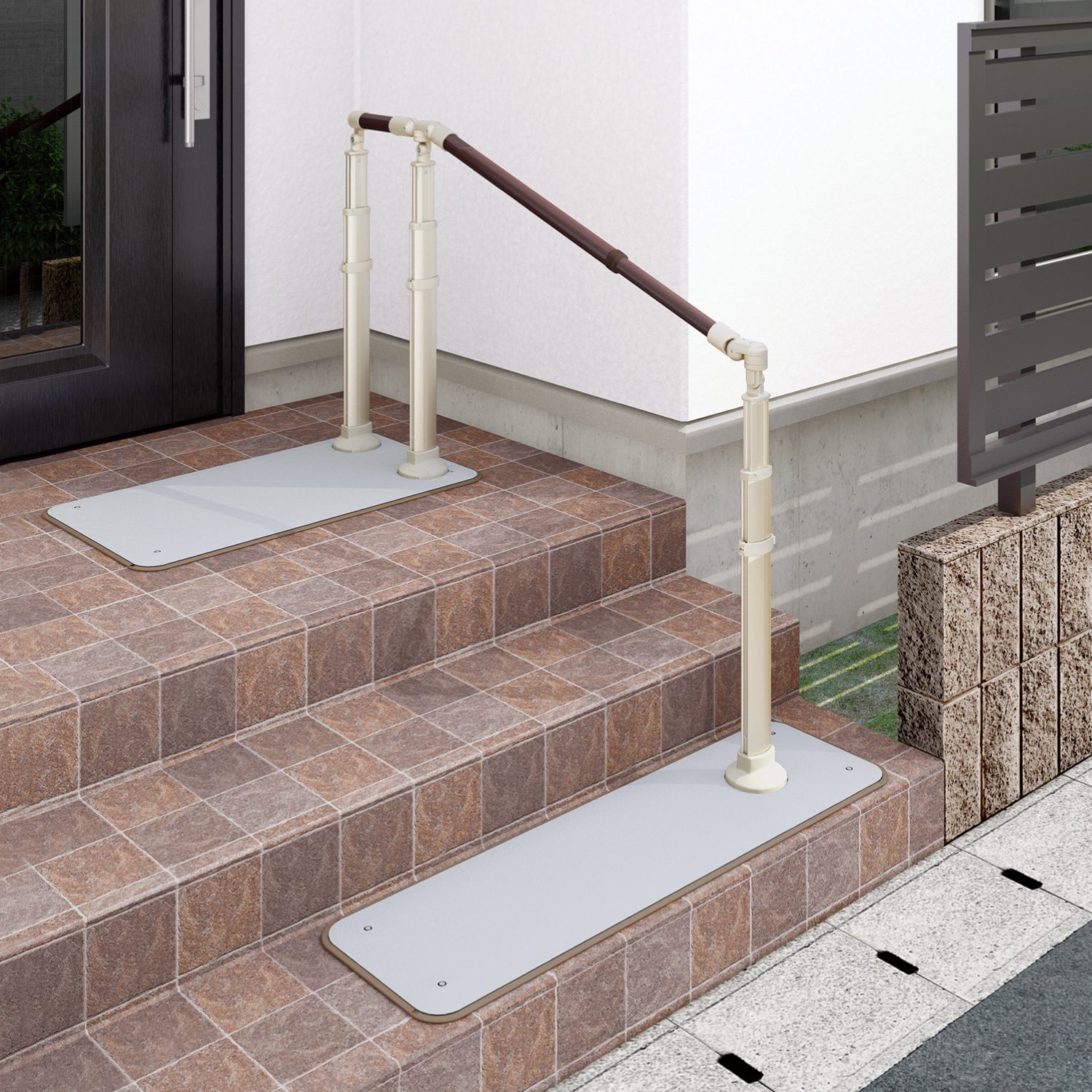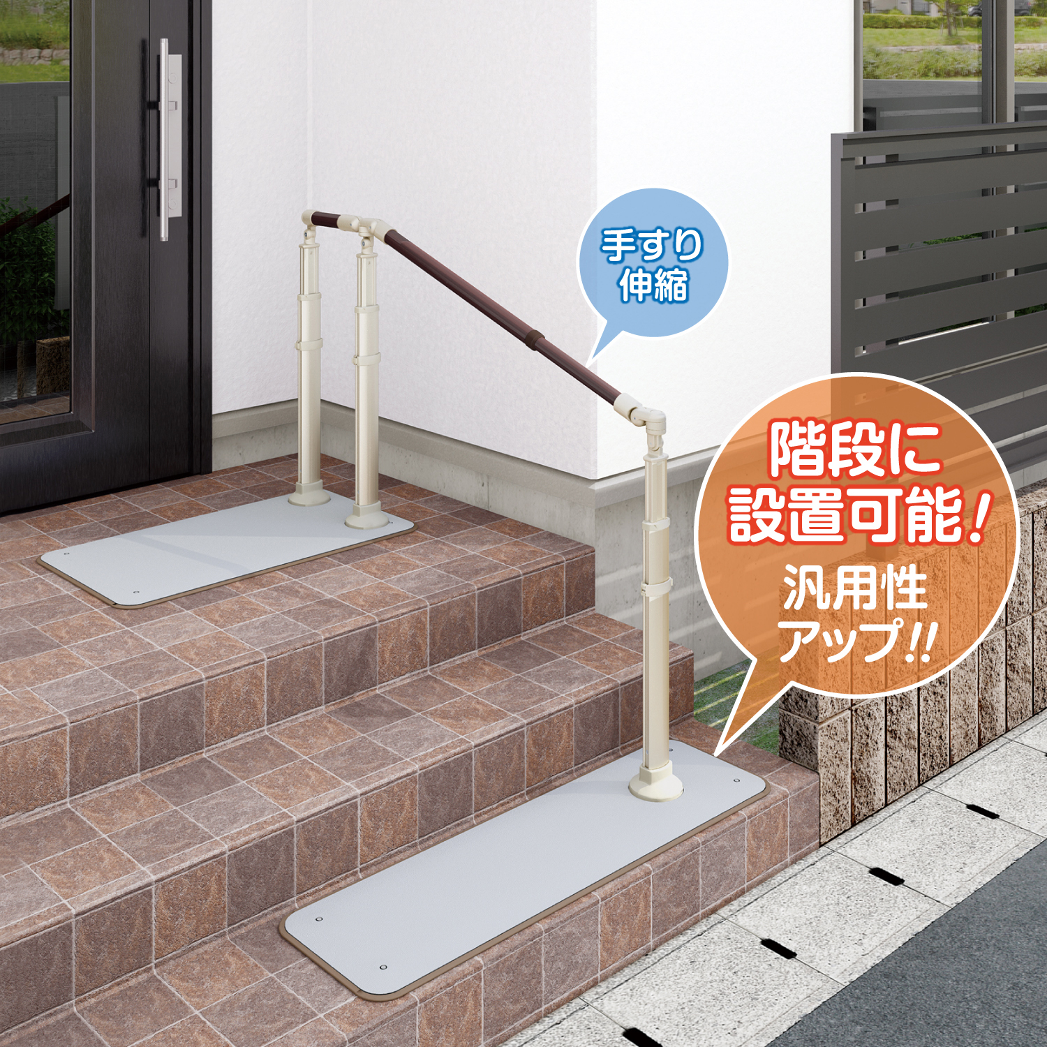公道に面した階段などへの設置に最適です。また手すりが伸縮するので設置時の微調整が簡単。高齢者の段差昇降の補助、動線の確保に。