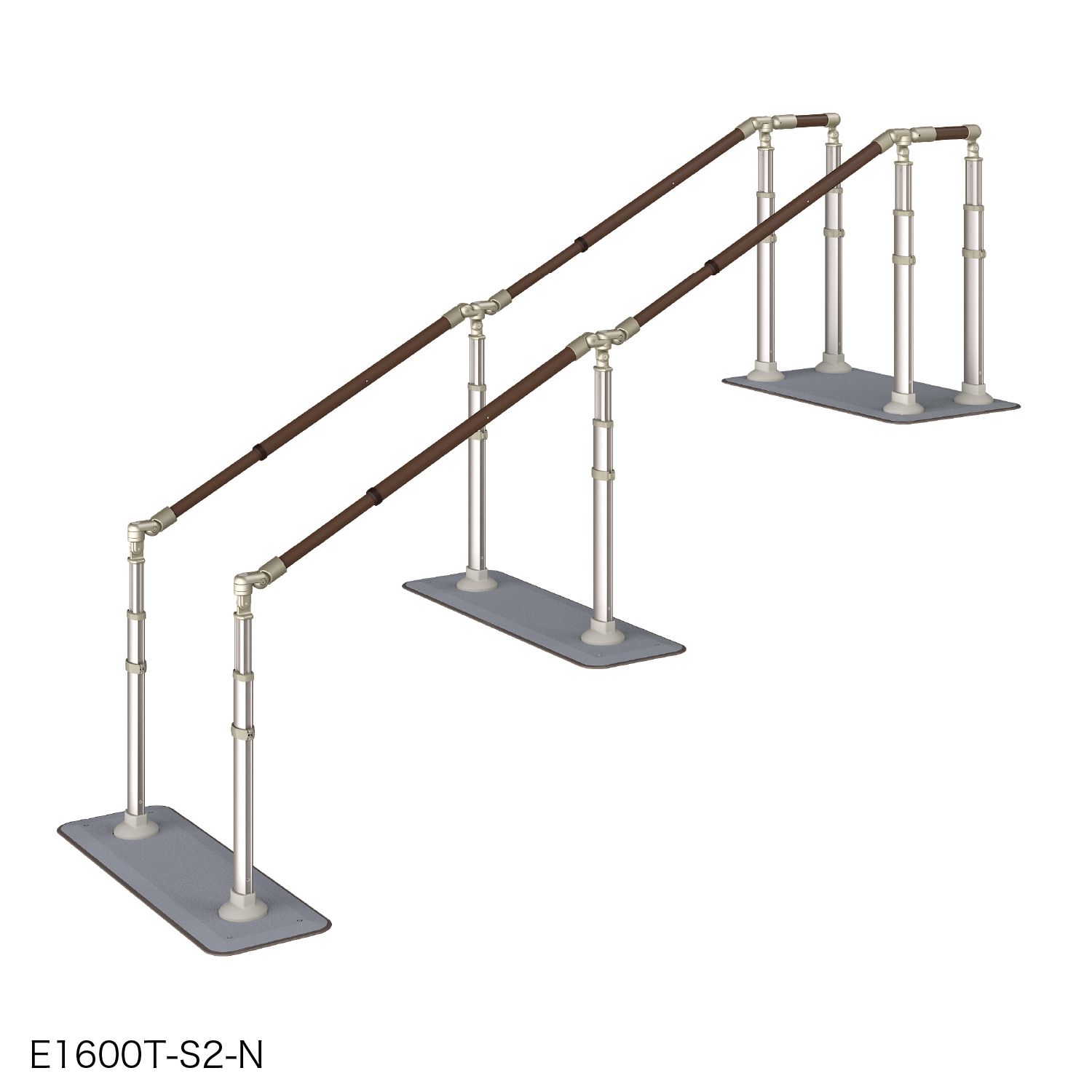 距離の長いポーチや玄関に設置できる手すりです。3枚のベースプレートと2本の手すりの幅広い組み合わせで様々なシーンに。