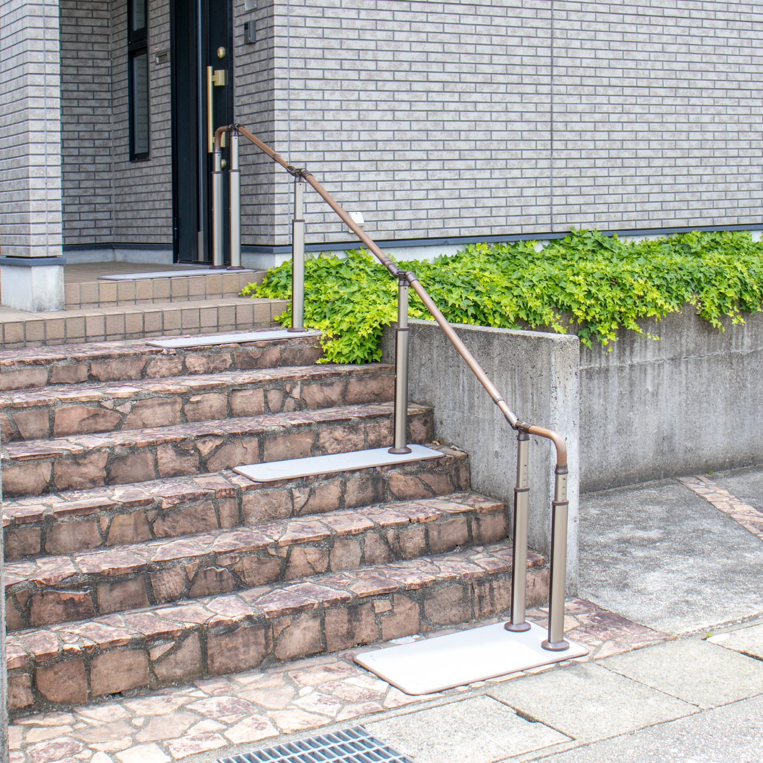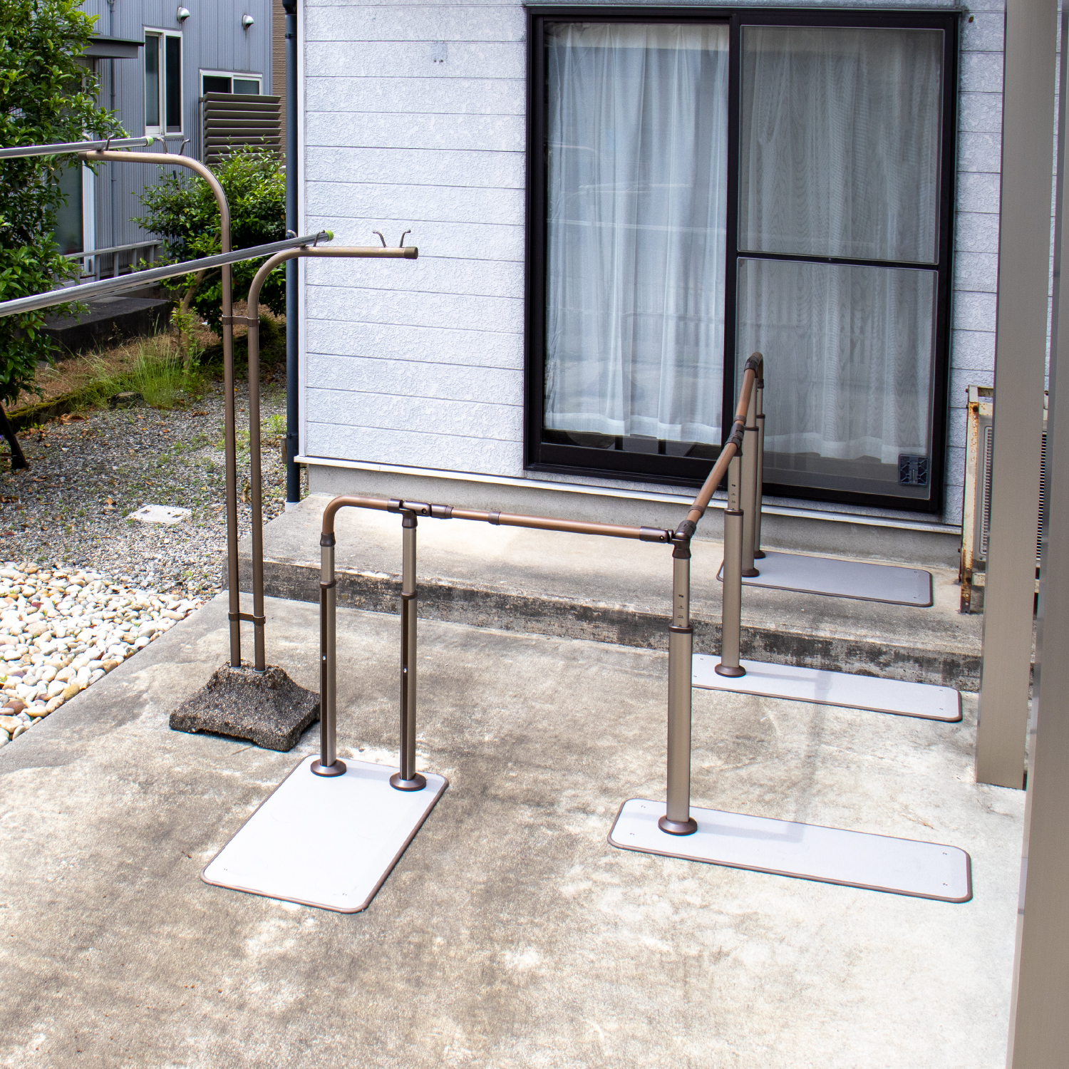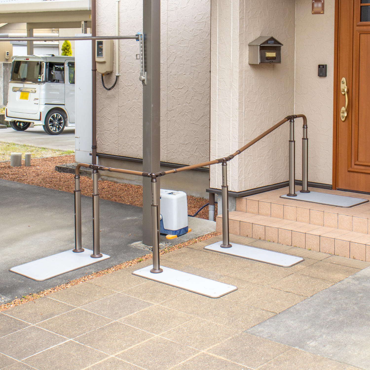 距離の長いポーチ部や玄関に設置。段差昇降や歩行を補助する据え置き手すり。