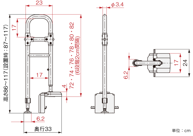 (上段手すり・中段手すり)エラストマー[表面]、スチール[芯材] (手すりパイプ[本体]、調節パイプB・C[かまち側・土間側]、ベースプレート、締め付けプレート)スチール (ベースプレート樹脂カバーB・C)PE (中段手すり樹脂カバー)PP (高さ調節固定ナット)ナイロン (アジャスタ)スチール