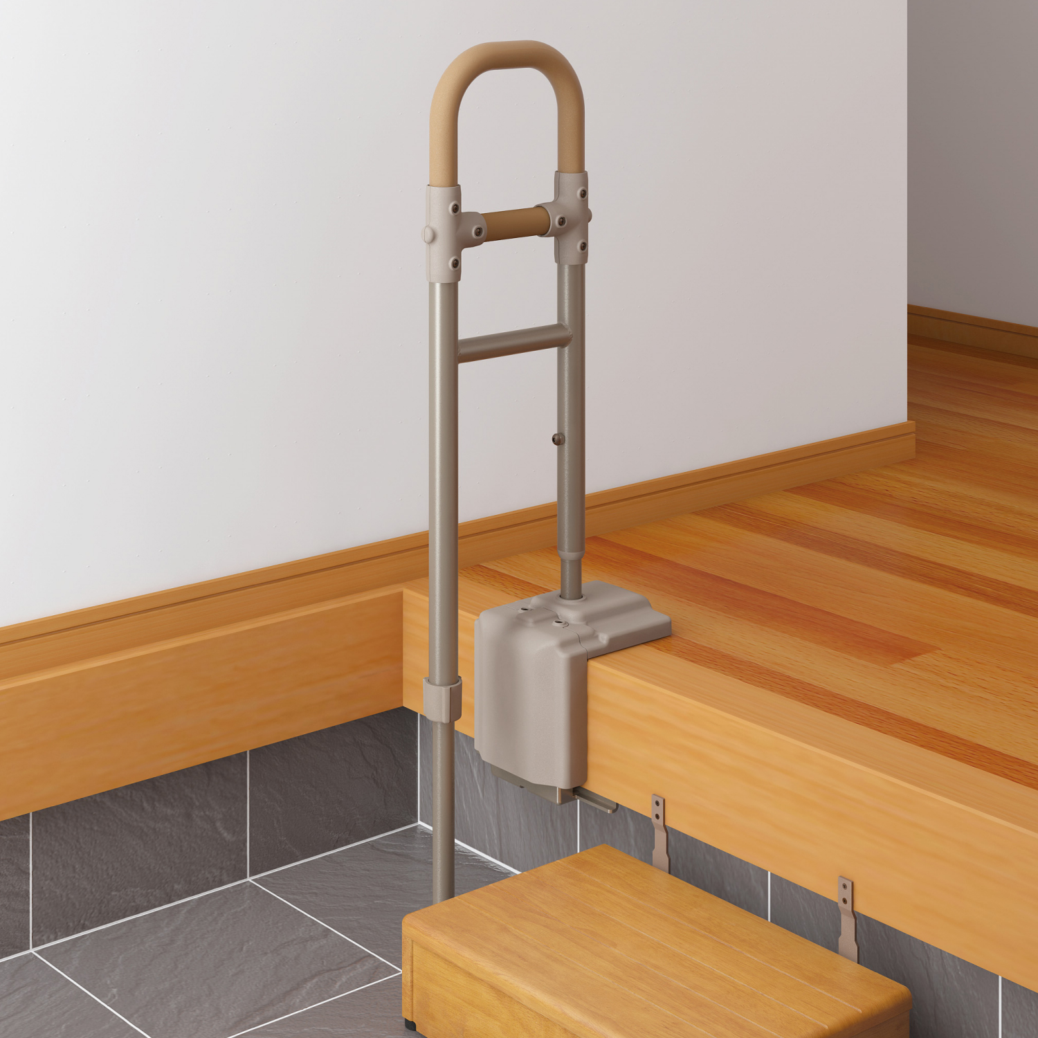 シンプル、コンパクト、安定感抜群、省スペースで安心して使用できる工事不要の玄関用手すりです。段差昇降時にからだを支えます。