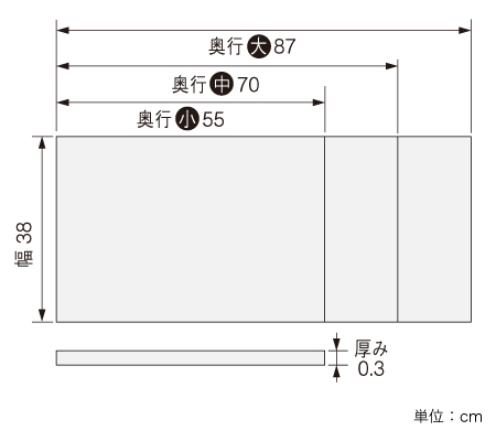 [小]幅38×奥行55×厚み0.3cm [中]幅38×奥行70×厚み0.3cm [大]幅38×奥行87×厚み0.3cm