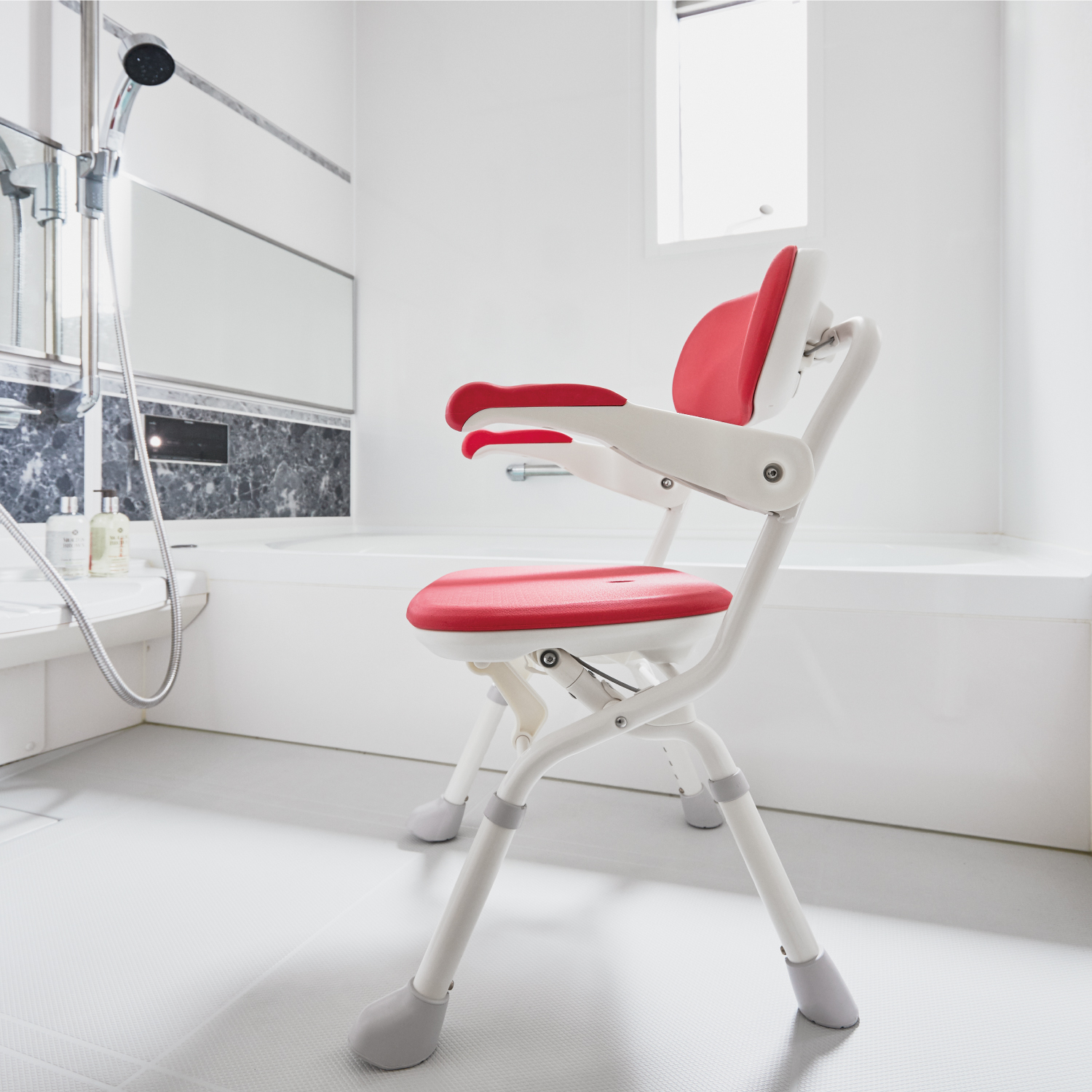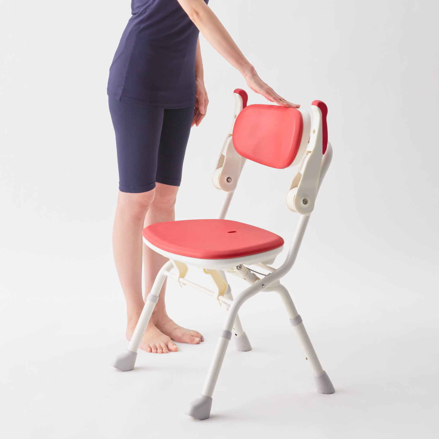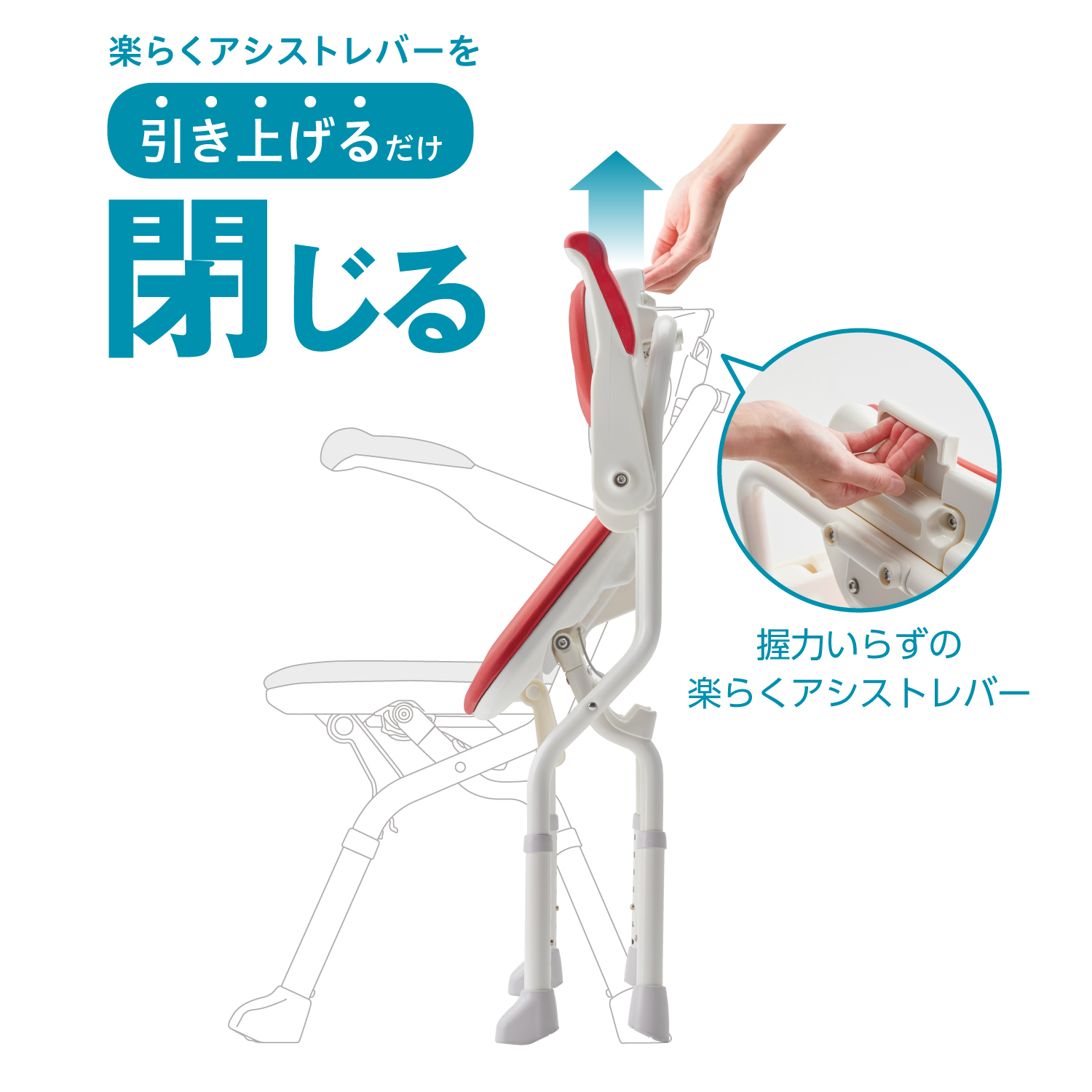 開くときは背もたれ上面を軽い力で押すだけでイスの状態にできます。楽らくアシストキャスターが開く動きをアシスト。また、たたむときは背もたれ背面の楽らくアシストレバーを引くだけ。握力の弱い高齢者の方、関節疾患の方でも楽に操作できます。壁際にシャワーベンチ(シャワーチェア)を置いている場合でも無理なく開閉操作が行えます。