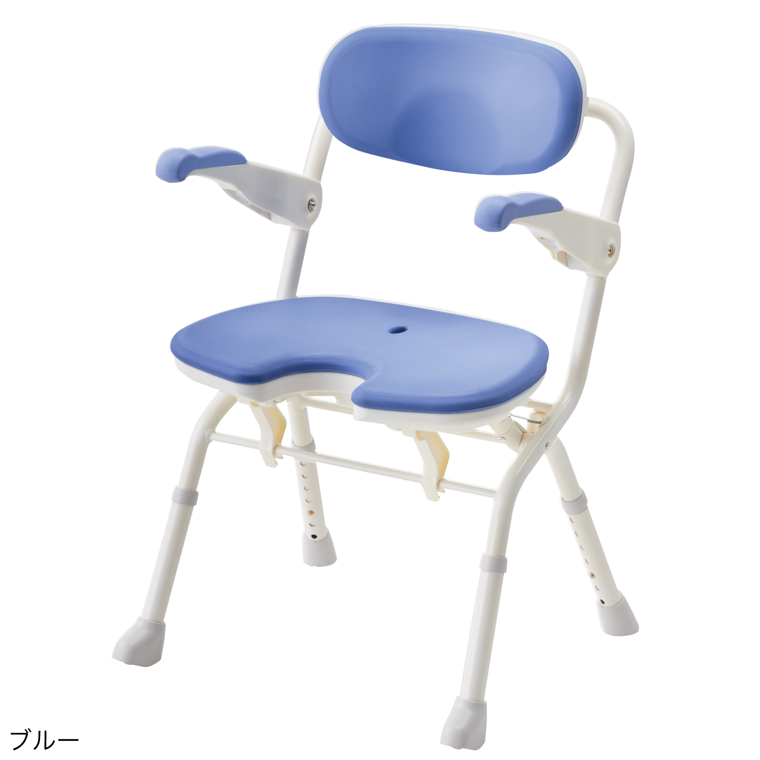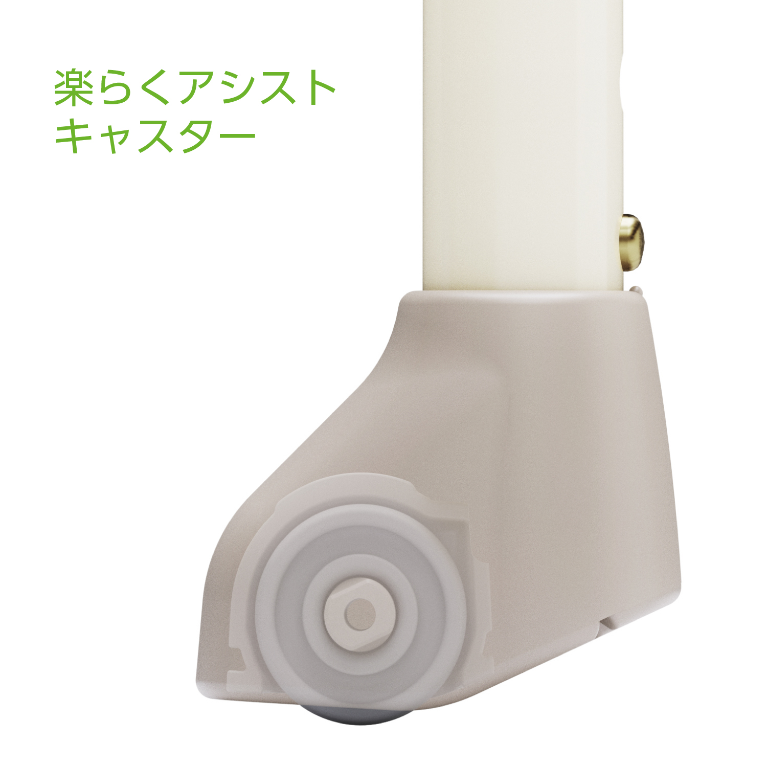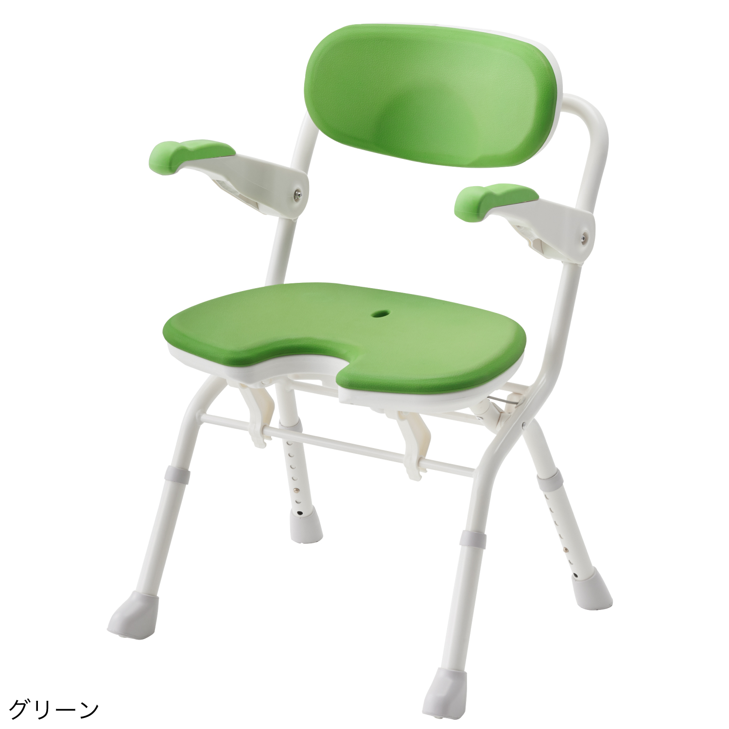 開くときは背もたれ上面を軽い力で押すだけでイスの状態にできます。楽らくアシストキャスターが開く動きをアシスト。また、たたむときは背もたれ背面の楽らくアシストレバーを引くだけ。握力の弱い高齢者の方、関節疾患の方でも楽に操作できます。壁際にシャワーベンチ(シャワーチェア)を置いている場合でも無理なく開閉操作が行えます。