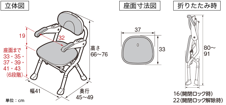幅41×奥行45~49×高さ66~76cm (座面までの高さ:33~43cm) (折りたたみ時:幅41×奥行16×高さ80~91cm)