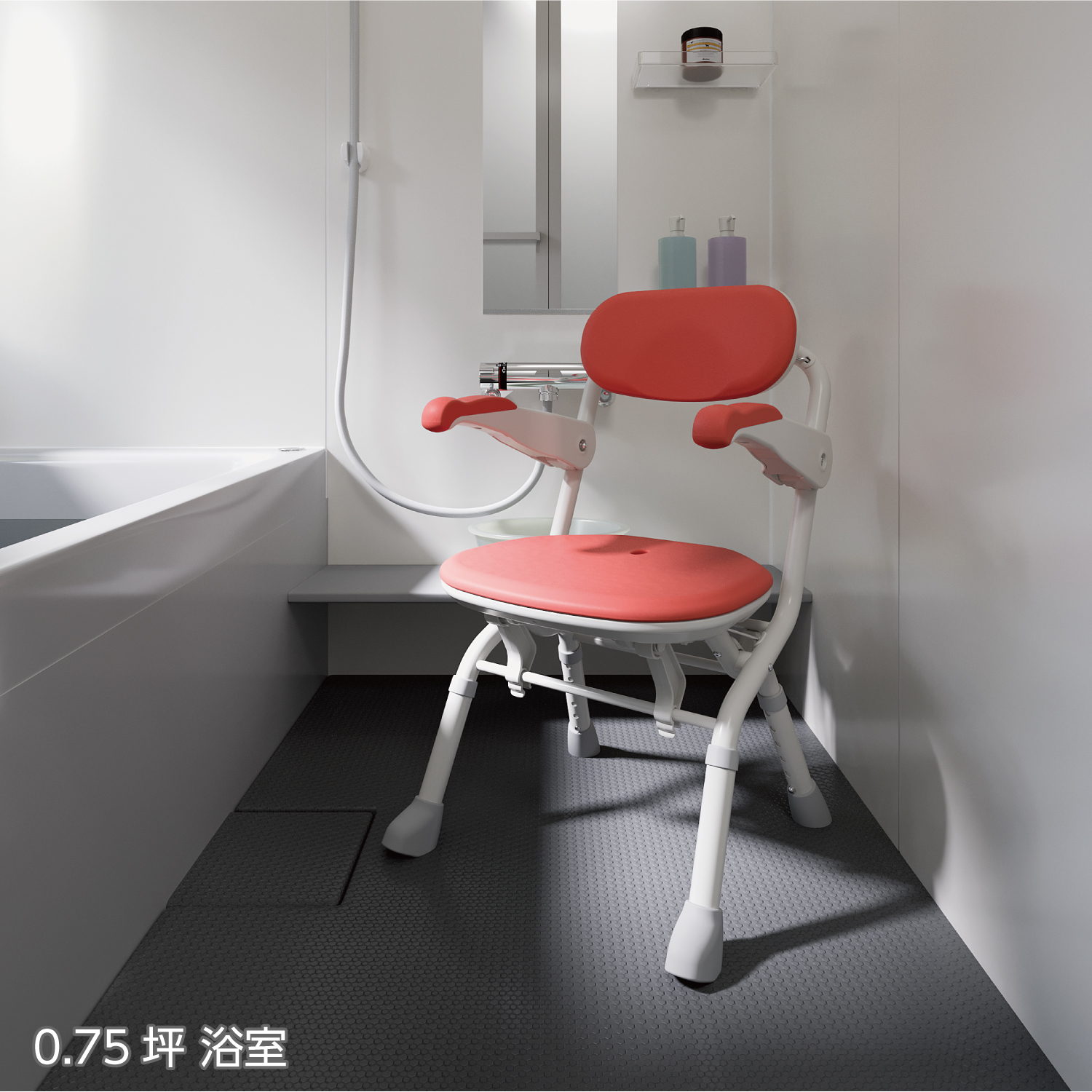 狭い浴室に置いても移動や体を洗うときに邪魔にならないコンパクトサイズです。0.75坪の浴室でも広くスペースを使えます。