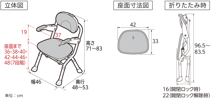 幅46×奥行48~53×高さ71~83cm (座面までの高さ:36~48cm) (折りたたみ時:幅46×奥行16×高さ83.5~96.5cm)