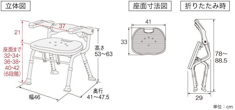 幅46×奥行41~47.5×高さ53~63cm (座面までの高さ:32~42cm) (折りたたみ時:幅46×奥行29×高さ78~88.5cm)