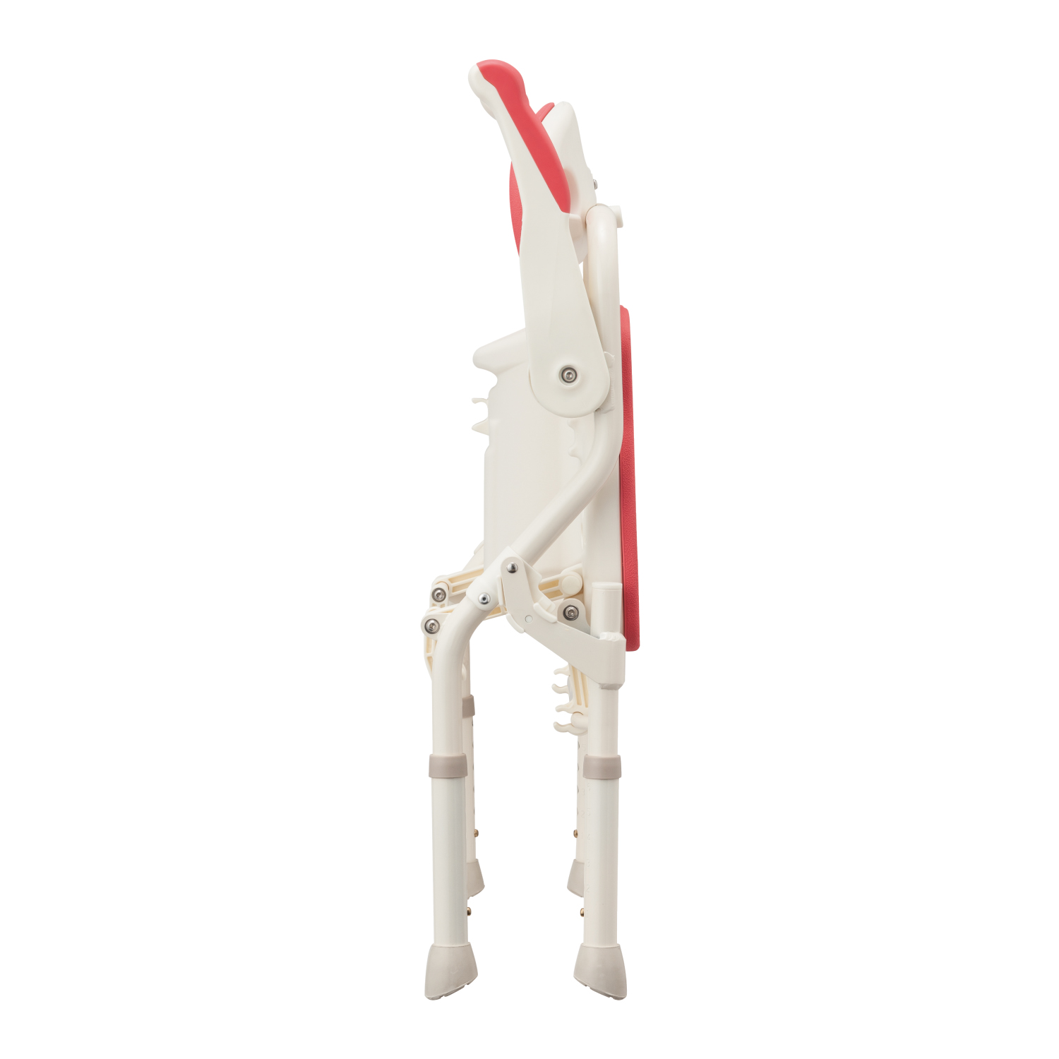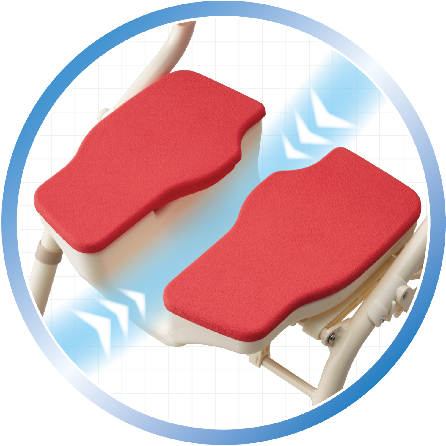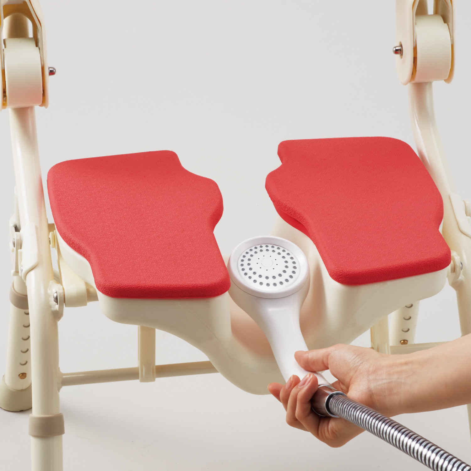 座ったままお尻が洗える、U字溝座面のシャワーベンチ。介助する人の負担を軽減します。