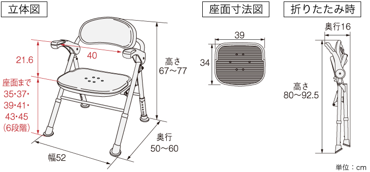 幅52×奥行50×高さ67~77cm (座面までの高さ:35~45cm) (折りたたみ時:幅52×奥行16×高さ80~92.5cm)