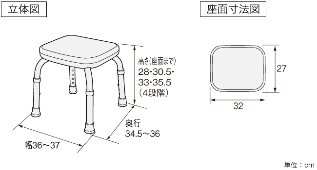 最小座面高さ28cm。小柄な方に最適なシャワーベンチ。