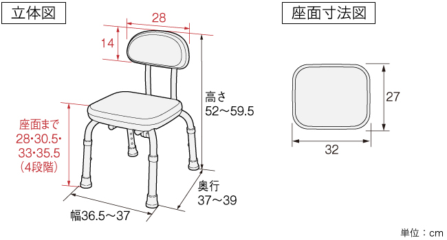 最小座面高さ28cm。小柄な方に最適なシャワーベンチ。