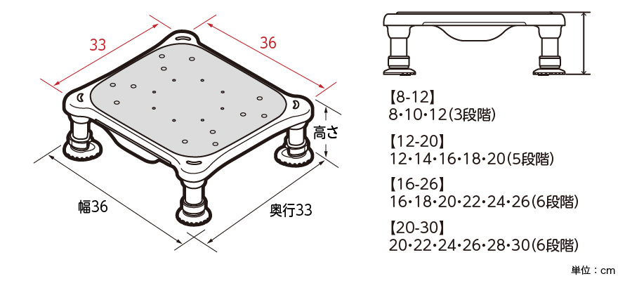 [8-12]幅36×奥行33×高さ8~12cm(3段階) [12-20]幅36×奥行33×高さ12~20cm(5段階) [16-26]幅36×奥行33×高さ16~26cm(6段階) [20-30]幅36×奥行33×高さ20~30cm(6段階)