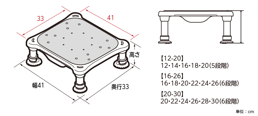 [12-20]幅41×奥行33×高さ12~20cm(5段階) [16-26]幅41×奥行33×高さ16~26cm(6段階) [20-30]幅41×奥行33×高さ20~30cm(6段階)