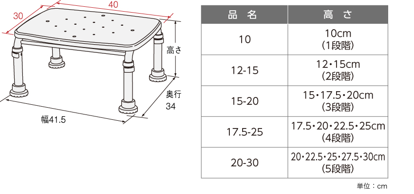 [10]幅41.5×奥行34×高さ10cm(1段階) [12-15]幅41.5×奥行34×高さ12・15cm(2段階) [15-20]幅41.5×奥行34×高さ15・17.5・20cm(3段階) [17.5-25]幅41.5×奥行34×高さ17.5・20・22.5・25cm(4段階) [20-30]幅41.5×奥行34×高さ20・22.5・25・27.5・30cm(5段階)