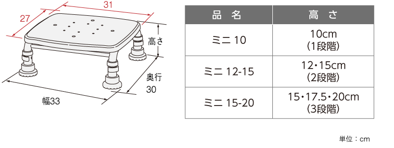 [10]幅33×奥行30×高さ10cm(1段階) [12-15]幅33×奥行30×高さ12・15cm(2段階) [15-20]幅33×奥行30×高さ15・17.5・20cm(3段階)