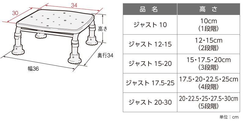 [10]幅36×奥行34×高さ10cm(1段階) [12-15]幅36×奥行34×高さ12・15cm(2段階) [15-20]幅36×奥行34×高さ15・17.5・20cm(3段階) [17.5-25]幅36×奥行34×高さ17.5・20・22.5・25cm(4段階) [20-30]幅36×奥行34×高さ20・22.5・25・27.5・30cm(5段階)