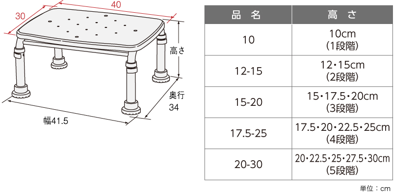 [10]幅41.5×奥行34×高さ10cm(1段階) [12-15]幅41.5×奥行34×高さ12・15cm(2段階) [15-20]幅41.5×奥行34×高さ15・17.5・20cm(3段階) [17.5-25]幅41.5×奥行34×高さ17.5・20・22.5・25cm(4段階) [20-30]幅41.5×奥行34×高さ20・22.5・25・27.5・30cm(5段階)