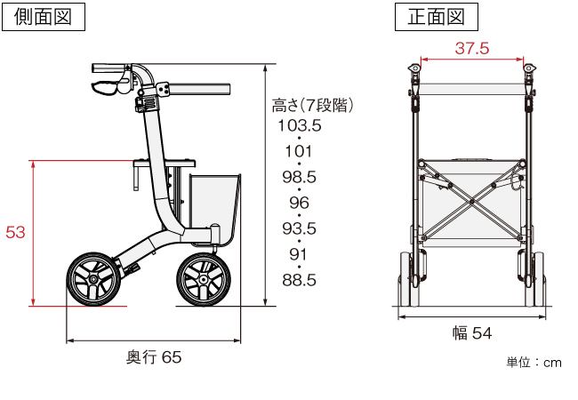 幅54×奥行65×高さ88.5~103.5cm(座面高)53cm(折りたたみ幅)26cm