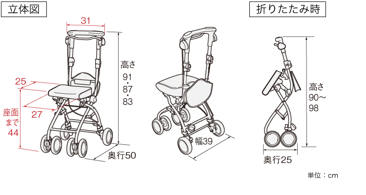 幅39×奥行50×高さ83・87・91cm(座面高)44cm (折りたたみ時:幅39×奥行25×高さ90~98cm)