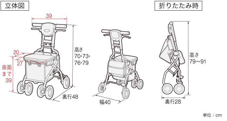 幅40×奥行48×高さ70・73・76・79cm(座面高)39cm (折りたたみ時:幅40×奥行28×高さ79~91cm)