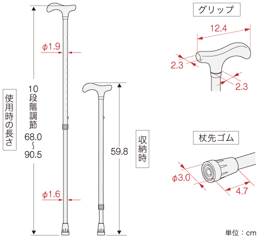 使用時の長さ68~90.5cm(2.5cm間隔 10段階調節) (全長:69~91.5cm/収納時:59.8cm)