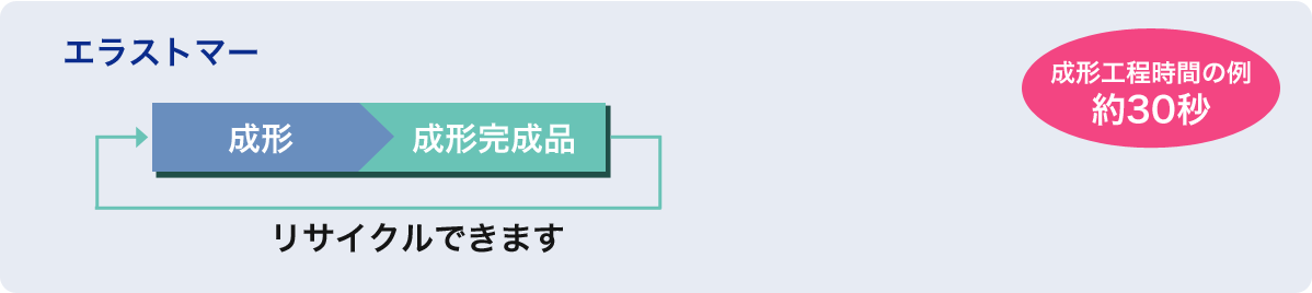 ○:成形サイクルが短く汎用の成形機で成形可能 | ×:加硫加工により成形サイクルが長い |