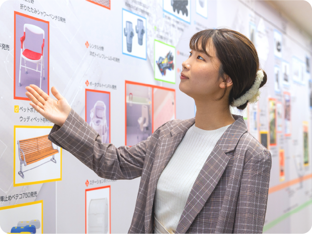 入社後、希望していたエコマテリアル事業部の企画部門に配属され、主に製品カタログやホームページの企画・管理など、プロモーション関連業務を担当しました。