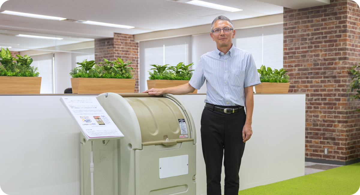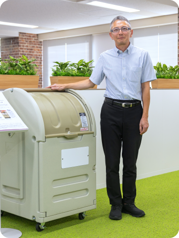 取り組み始めて3か月ほどで、エラストマーの製造設備を応用するという方法で、樹脂加工に適したかたちにできるというところまで行き着きました。プラスチックをペレット化できれば、当社の技術や知見を使って加工の方法はいろいろ思いつきます。リサイクルプラスチックを使って、当社のゴミ収集保管容器「ステーションボックス」に成形し、使用済み紙おむつ専用の回収ボックスとして製品化を実現しました。ユニ・チャームさんとお会いしてちょうど1年が経った頃だったかと思います。担当者の方に「これほど早く製品化できるとは思いませんでした」という言葉とともに多くの感謝の言葉をいただき、大変光栄に思いました。