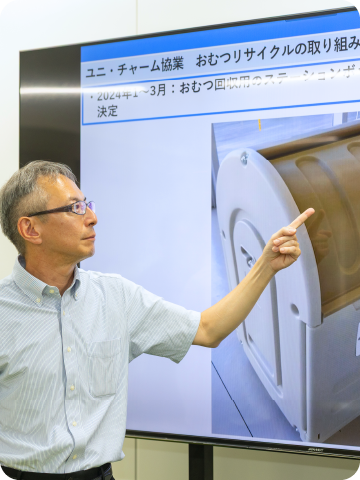 私は、当社の有する技術・知見を使ってリサイクル素材の活用方法を検討する技術担当として、本プロジェクトに関わりました。少子高齢化が進む日本では、大人用紙おむつの廃棄量が子ども用の減少分を上回るペースで増え続け、一般廃棄物に占める割合は2015年の約5%から、2030年には約7%になると見込まれています。使用済み紙おむつのリサイクルは大きな社会課題だと感じ、こうした課題に取り組めることにやりがいを覚える一方、いろいろな素材から構成される使用済み紙おむつのリサイクルなど本当に可能なのか?と、半信半疑だったことも事実です。