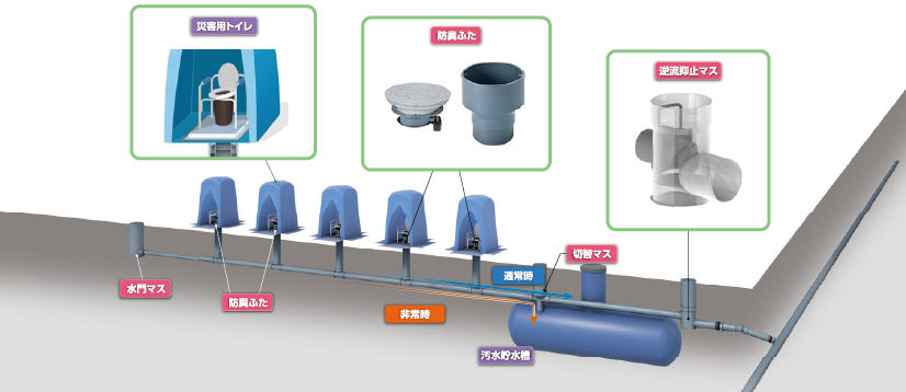 当社の環境インフラシステム事業部は、災害発生直後に避難所においてトイレ機能を速やかに構築することができる「災害用トイレ排水システム」を提供しています。配管内からの嫌な臭いを軽減する機能や下水本管からの逆流を抑止する機能も備えた、災害時でも非常に衛生的かつ安全なトイレを確保することができる独自のシステムです。