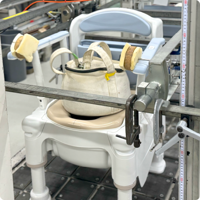 介護用品を使う方の多くは身体が不安定なため、無意識のうちに危険な使い方をしてしまう場合があります。そこで「安寿」では、想定されるあらゆる使い方を抽出し、それに耐えられる強度と性能を確保した構造にしています。そのため、公的な安全規格を満たすことはもちろんのこと、その他にもさまざまな症状や使用環境を想定した独自の評価試験を数多く実施しています。こうした取り組みにより、日常の中で安心して使える製品を提供しています。