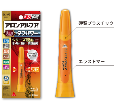 「アロンアルフア」の容器をご覧いただくと、黄色い部分と濃いオレンジ色の部分が確認できます。黄色い部分は硬質プラスチック、濃いオレンジ色の部分は当社のエラストマーと呼ばれる柔らかいゴム状の素材を採用しており、二層成形で一体化させています。容器にこのエラストマーを採用することで、押しやすさや滑りにくさを備え、接着剤の繊細な液量をコントロールすることが可能となっています。